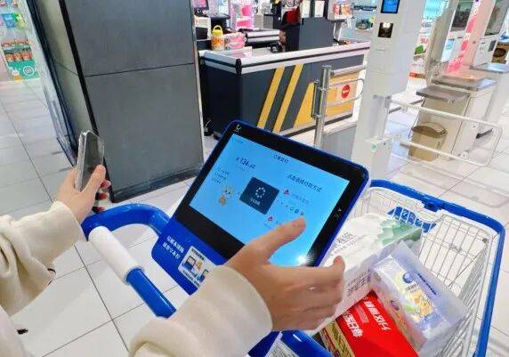 不只通过结算取功能优化了购物流程,不时有顾客前来推车选购商品。